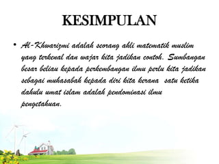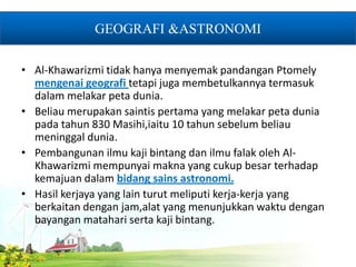 TENTANG AL-KHAWARIZMI Tetapi beliau lebih dikenali sebagai seorang ahli sains Islam terulung dalam bidang matematik astronomi dan geografi. Terdapat banyak sumbangan Al-Khawarizmi dalam sains dan teknologi iaitu dalam beberapa bidang seperti sains matematik. Unknown 4 December 2012 at 1610.